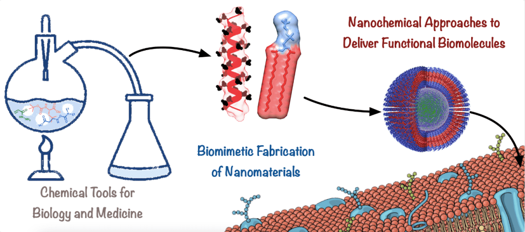Our goal is to develop new nanocarriers capable of efficiently delivering the next generation of biomolecular therapies. By fabricating and modifying biomimetic nanomaterials and developing new chemical tools, we can program nanocarriers with properties like improved stability, enhanced targeting of cellular biomarkers, and responsive controlled release of therapeutic cargo. This will help underpin the efficient delivery of membrane active peptides and functional nucleic acids to target sites.